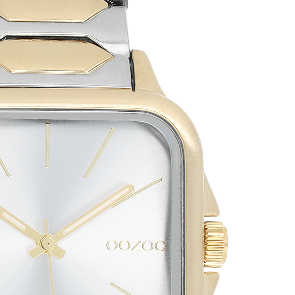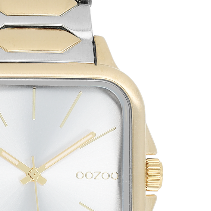 Ρολόι OOZOO με τετράγωνη χρυσή κάσα, ασημένιο καντράν και δίχρωμο ασημένιο/χρυσό μπρασελέ.