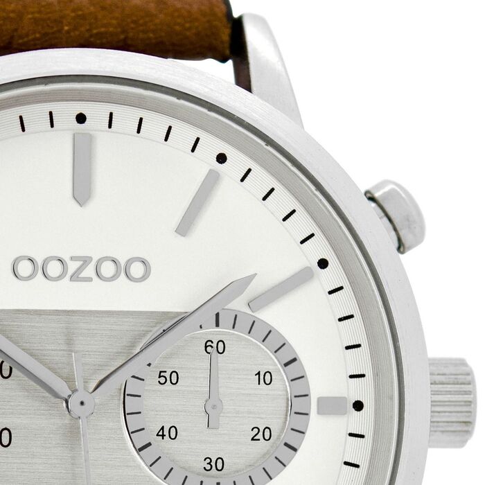 Aνδρικό ρολόι της εταιρίας Oozoo, μεγάλου μεγέθους με δερμάτινο λουράκι σε καφέ χρώμα. Διαθέτει μηχανισμό μπαταρίας, ο οποίος βασίζεται στην ηλεκτρική ενέργεια που παρέχει η μπαταρία, με αποτέλεσμα να υπάρχει ακρίβεια και αντοχή. Είναι ανθεκτικό σε ελάχιστη επαφή με το νερό (πιτσίλισμα) και θα πρέπει να αποφεύγεται οποιαδήποτε μεγαλύτερη επαφή μαζί του (3 atm/30 μέτρα).