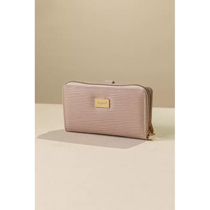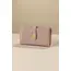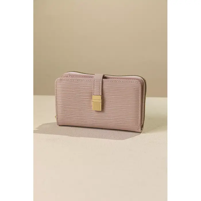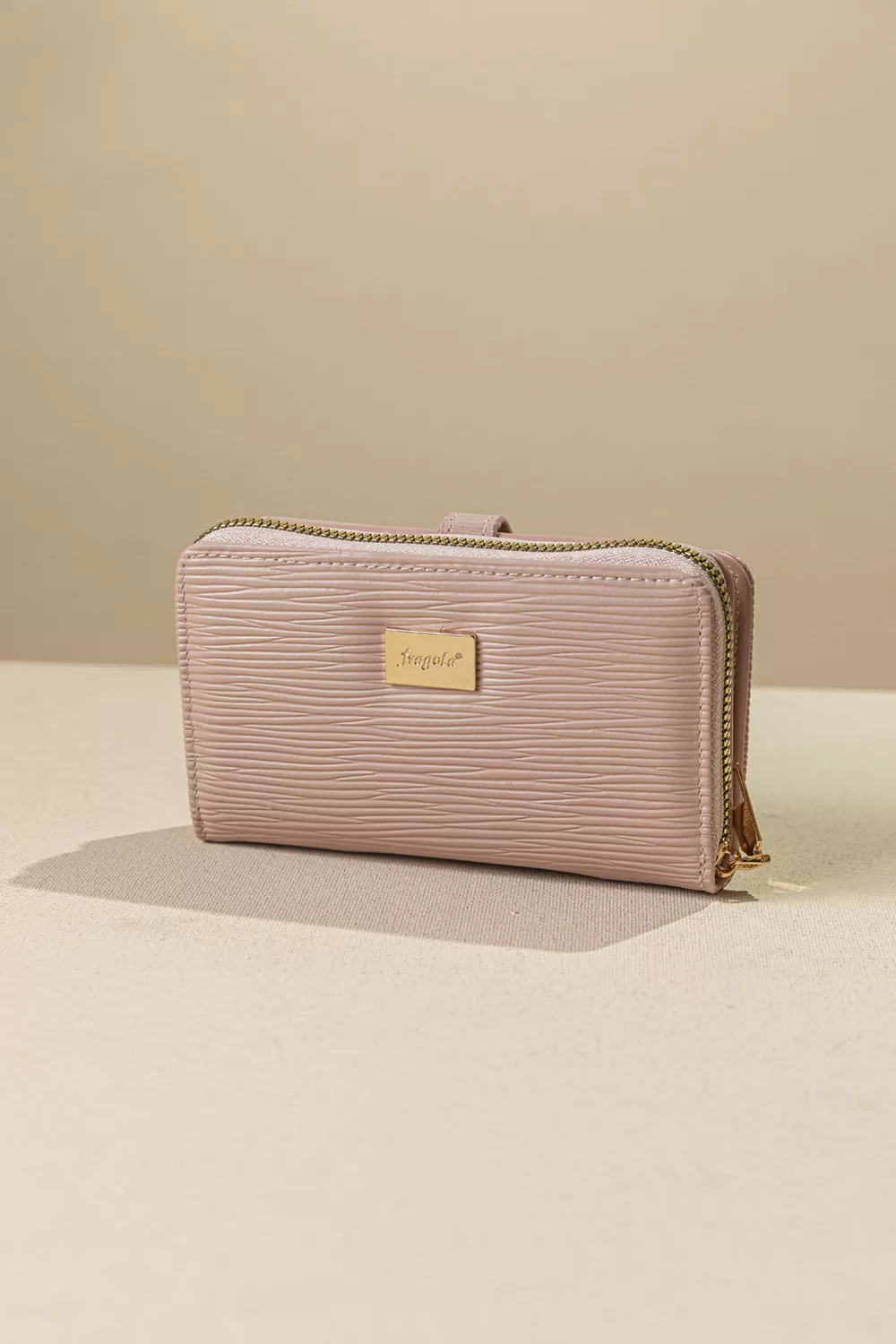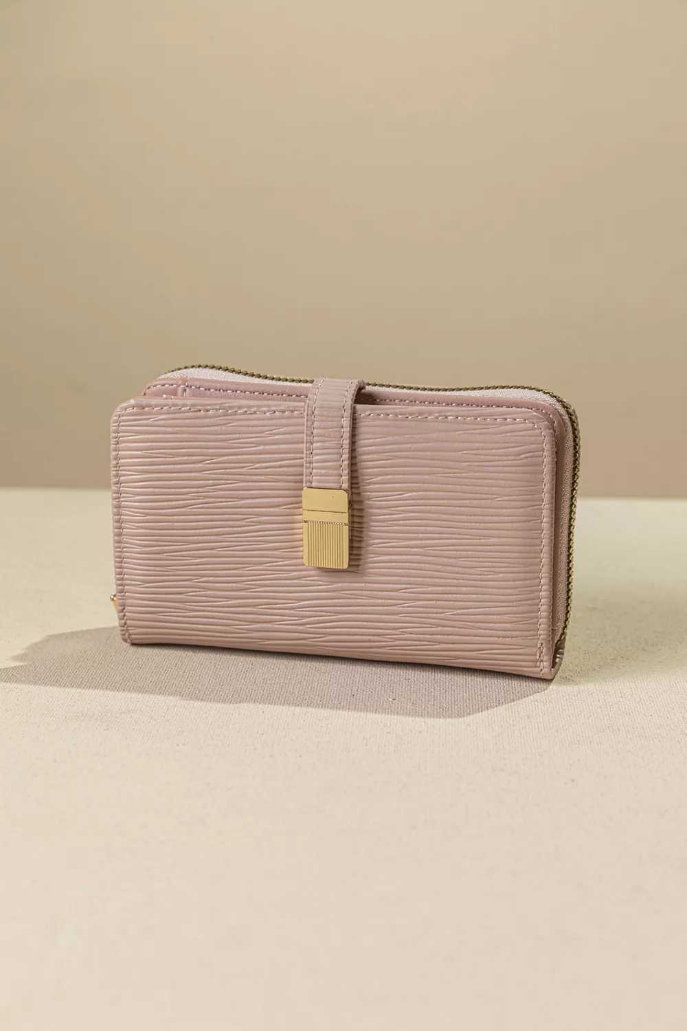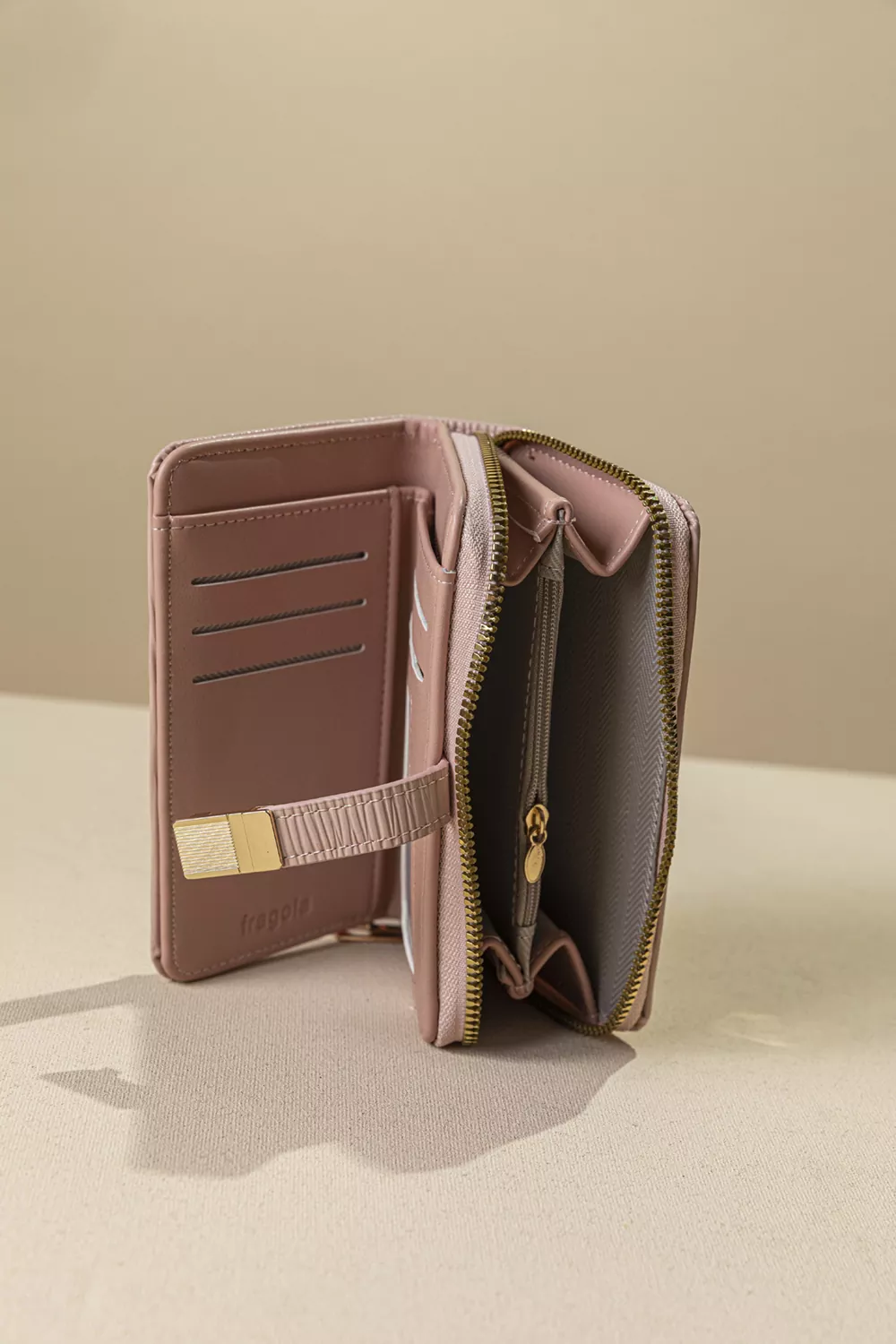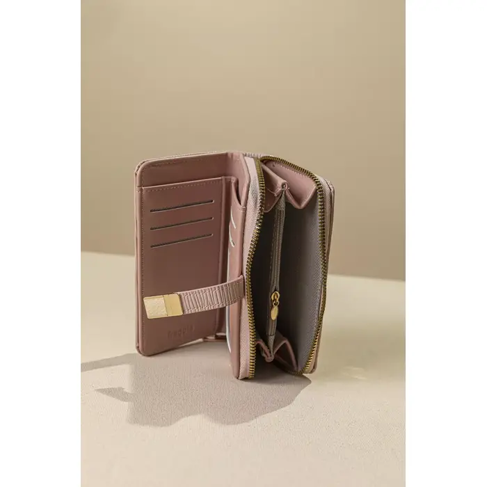 • Κομψό γυναικείο πορτοφόλι μεσαίου μεγέθους ιδανικό για καθημερινή χρήση. • Ο minimal σχεδιασμός του με το χρυσό μεταλλικό κούμπωμα χαρίζει μια διακριτική πολυτέλεια. Το εσωτερικό του είναι πρακτικά οργανωμένο με πολλαπλές θέσεις για κάρτες, διάφανη θήκη για ταυτότητα ή δίπλωμα, καθώς και ξεχωριστό χώρο για χαρτονομίσματα. • Διαθέτει επίσης θήκη για κέρματα με φερμουάρ, προσφέροντας εύκολη πρόσβαση. • Compact αλλά ευρύχωρο, χωράει όλα τα απαραίτητα χωρίς να πιάνει χώρο στη τσάντα σας.