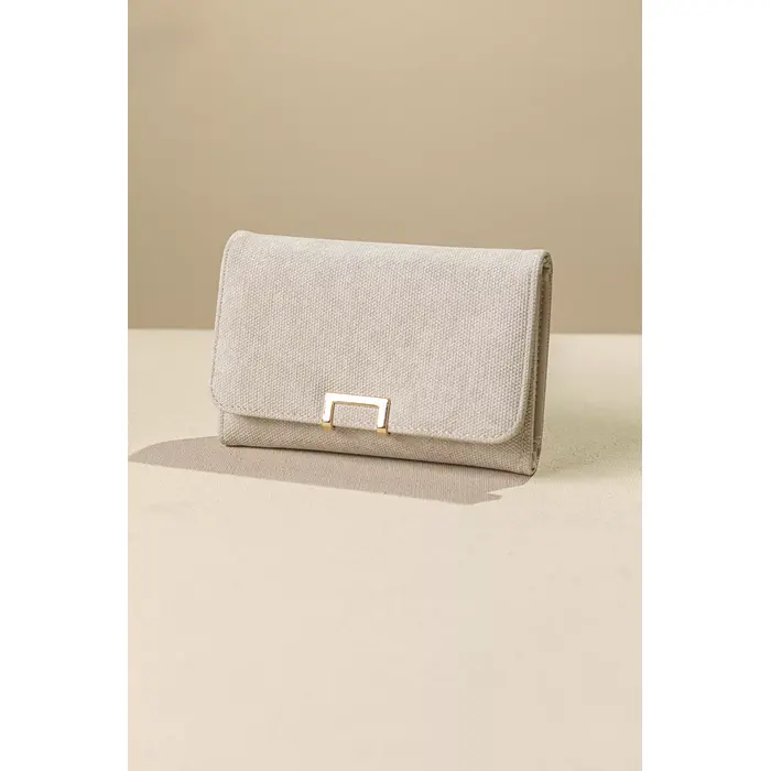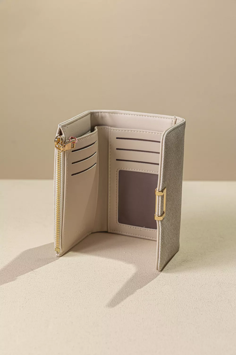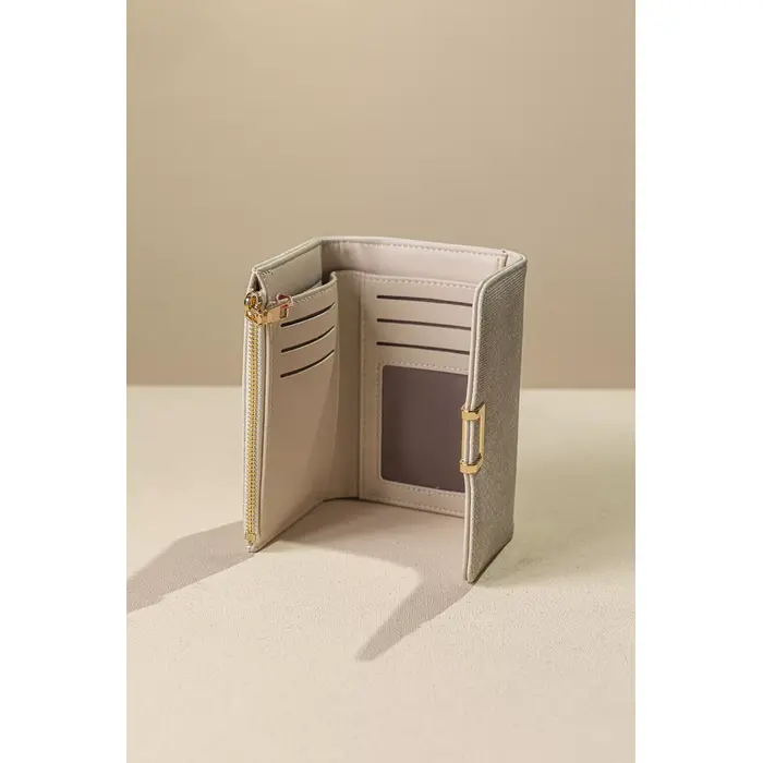 • Κομψό γυναικείο πορτοφόλι μεσαίου μεγέθους ιδανικό για καθημερινή χρήση. • Ο minimal σχεδιασμός του με το χρυσό μεταλλικό κούμπωμα χαρίζει μια διακριτική πολυτέλεια. Το εσωτερικό του είναι πρακτικά οργανωμένο με πολλαπλές θέσεις για κάρτες, διάφανη θήκη για ταυτότητα ή δίπλωμα, καθώς και ξεχωριστό χώρο για χαρτονομίσματα. • Διαθέτει επίσης θήκη για κέρματα με φερμουάρ, προσφέροντας εύκολη πρόσβαση. • Compact αλλά ευρύχωρο, χωράει όλα τα απαραίτητα χωρίς να πιάνει χώρο στη τσάντα σας.