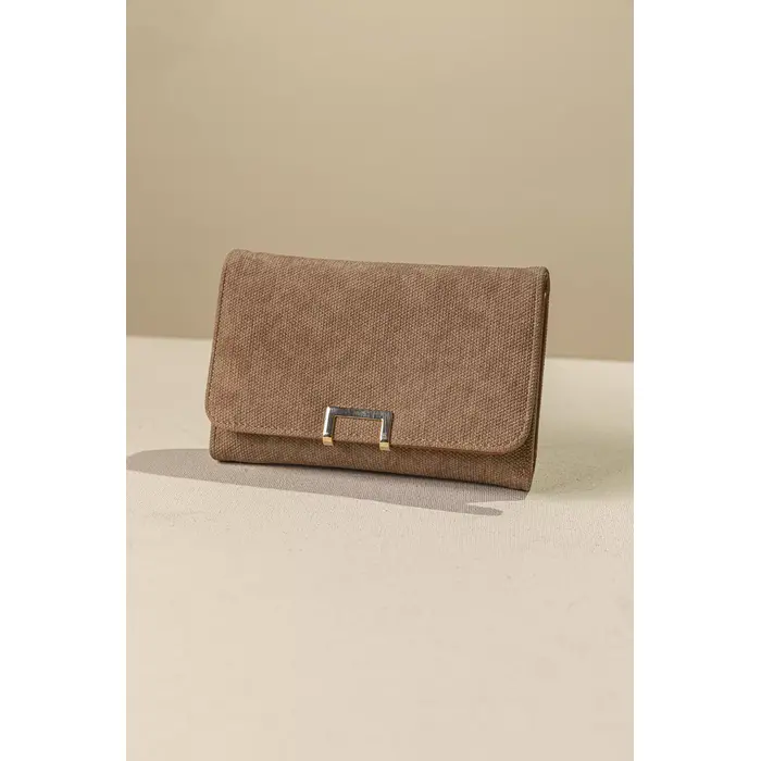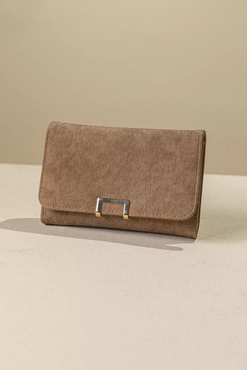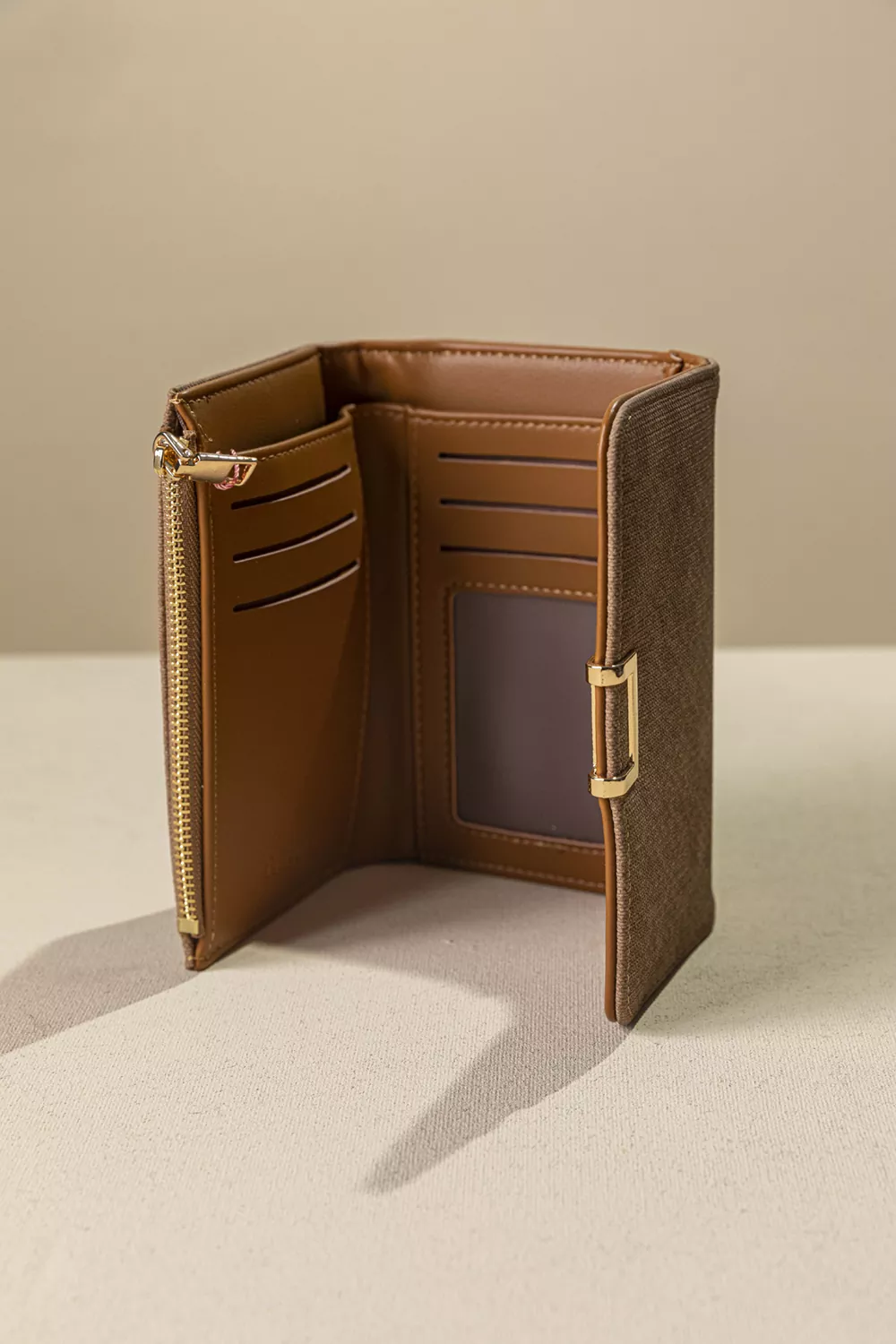 • Ο minimal σχεδιασμός του με το χρυσό μεταλλικό κούμπωμα χαρίζει μια διακριτική πολυτέλεια. Το εσωτερικό του είναι πρακτικά οργανωμένο με πολλαπλές θέσεις για κάρτες, διάφανη θήκη για ταυτότητα ή δίπλωμα, καθώς και ξεχωριστό χώρο για χαρτονομίσματα.