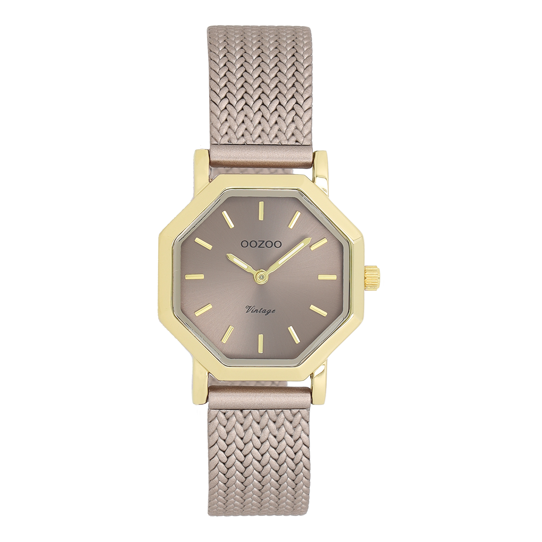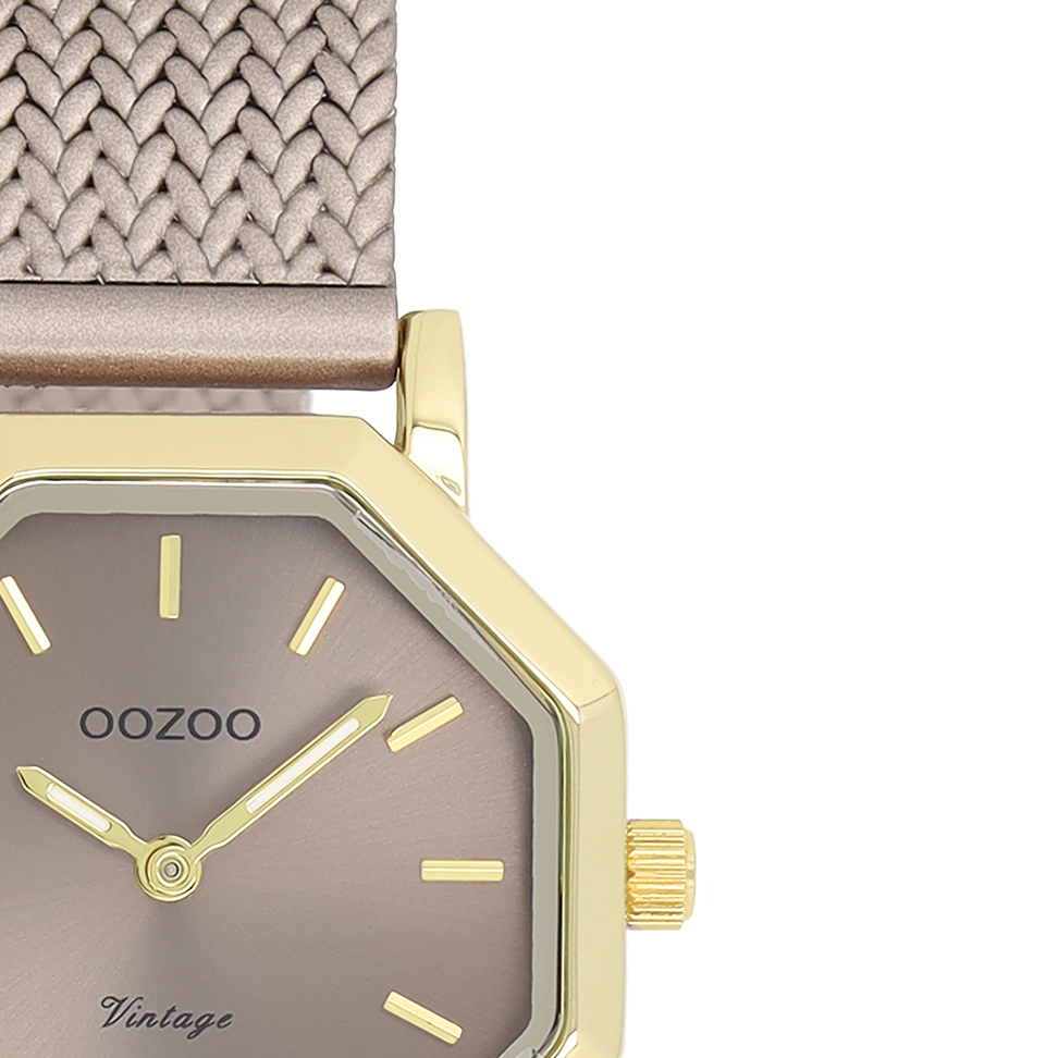 Ρολόι OOZOO με οκτάγωνη χρυσή κάσα, καντράν taupe και μπρασελέ V-mesh από ανοξείδωτο ατσάλι σε χρώμα taupe.