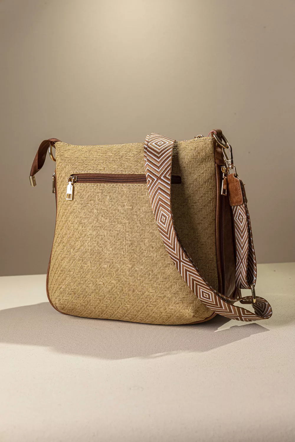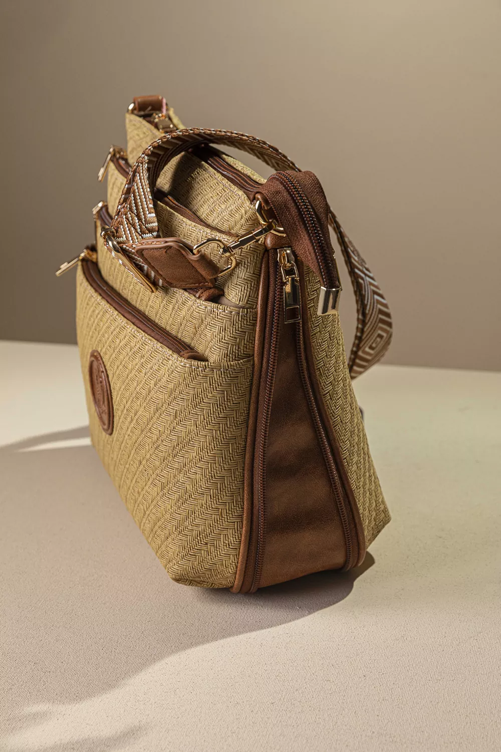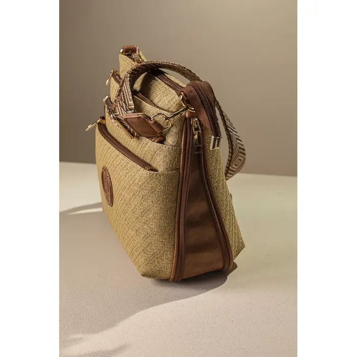 Υλικό: Συνθετικό ανάγλυφο δέρμα με μορφή ψάθας σε γήινα χρώματα.