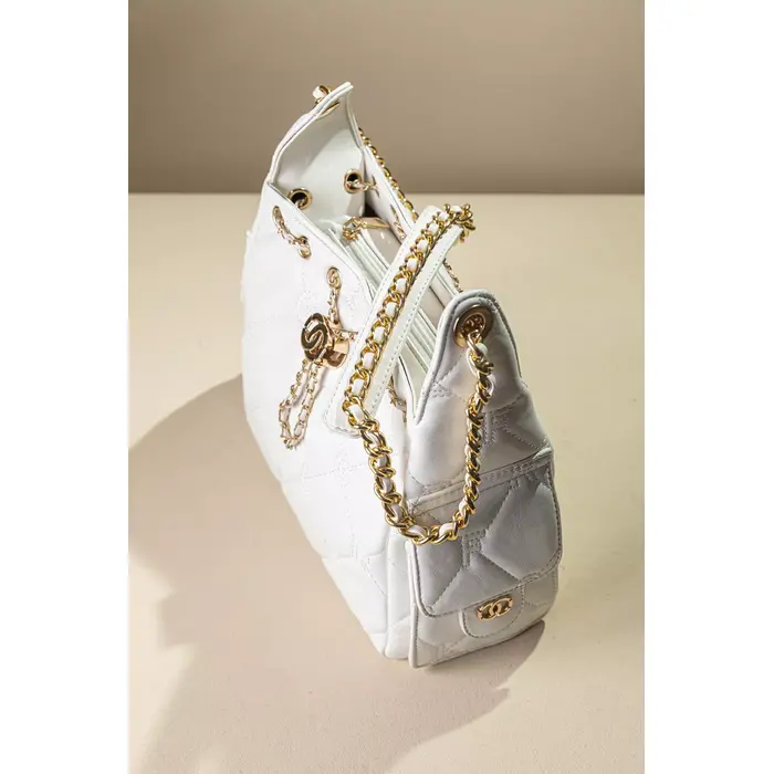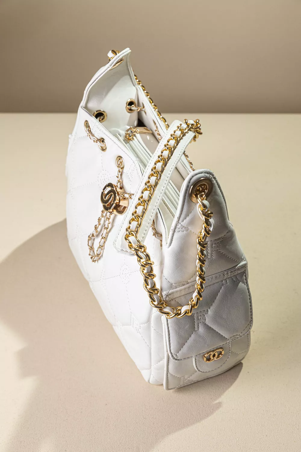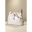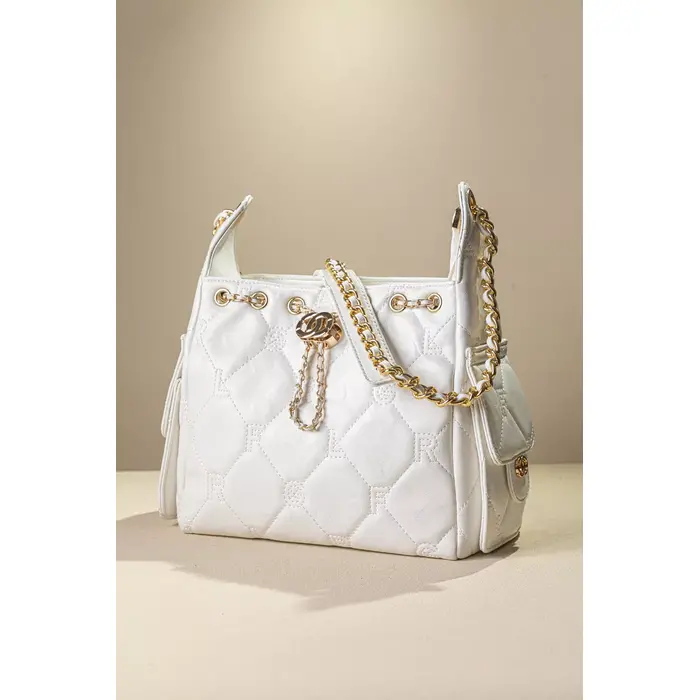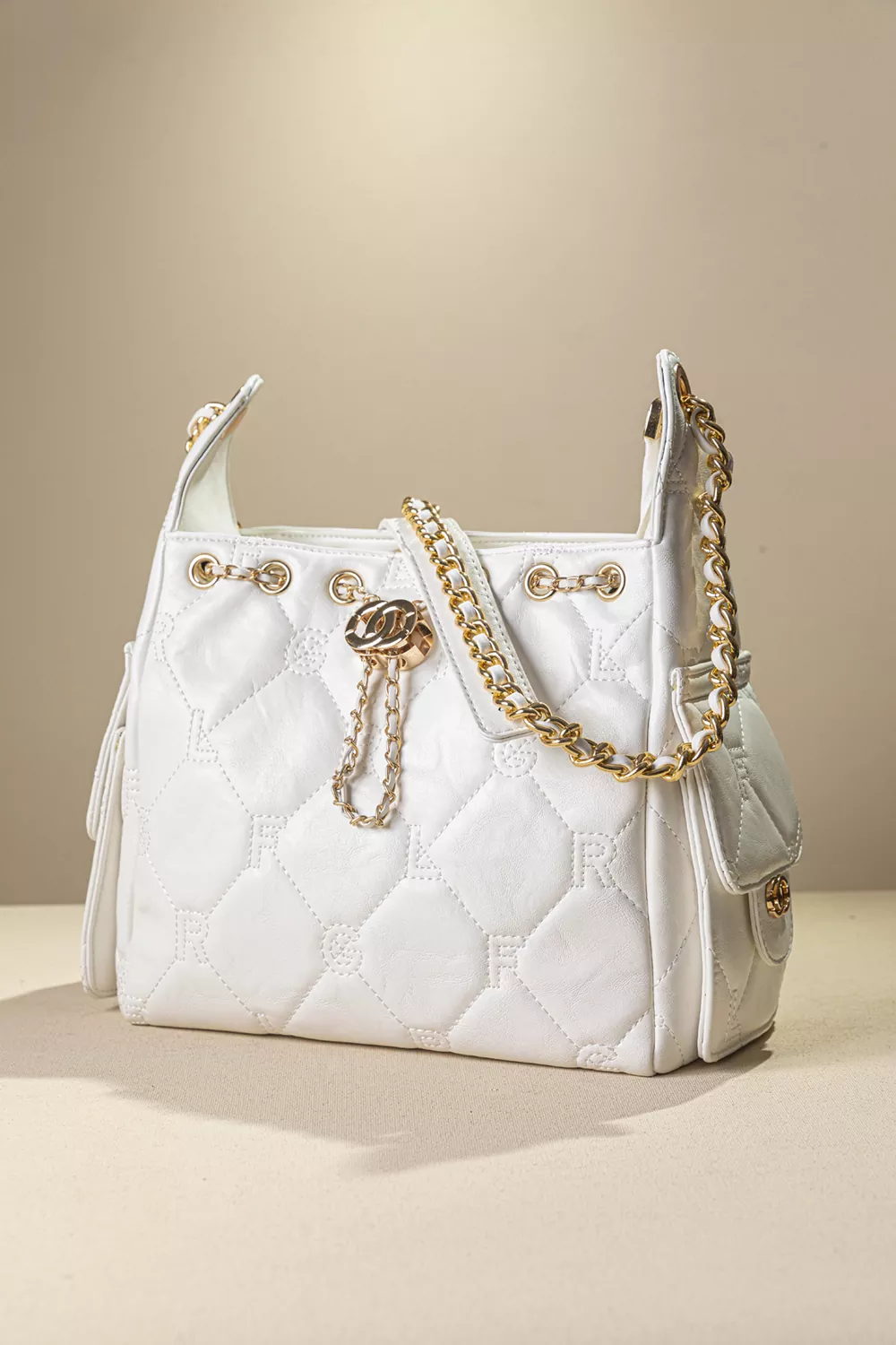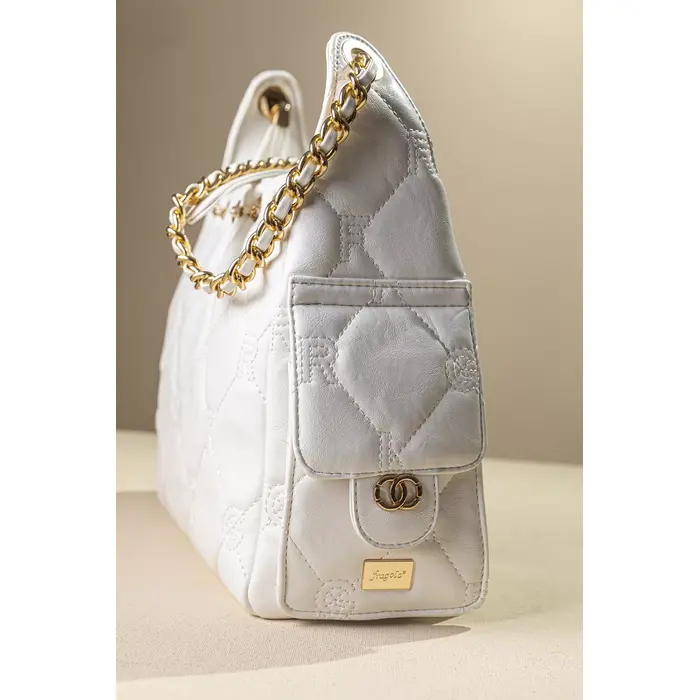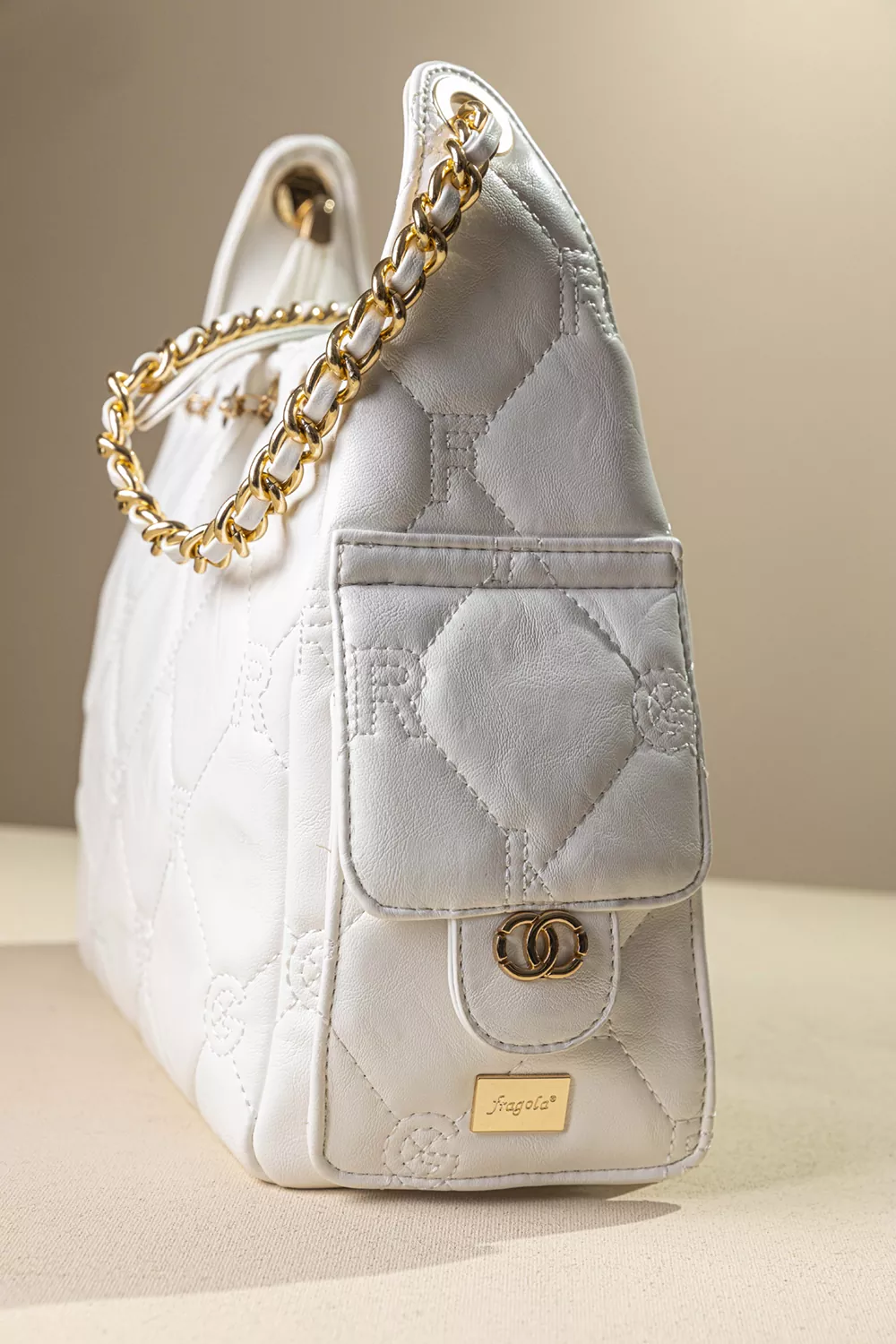• Γυναικεία τσάντα ώμου κατασκευασμένη από μαλακό συνθετικό δέρμα με παλαιωμένη όψη και καπιτονέ γαζιά που απεικονίζουν τα γράμματα της εταιρείας.