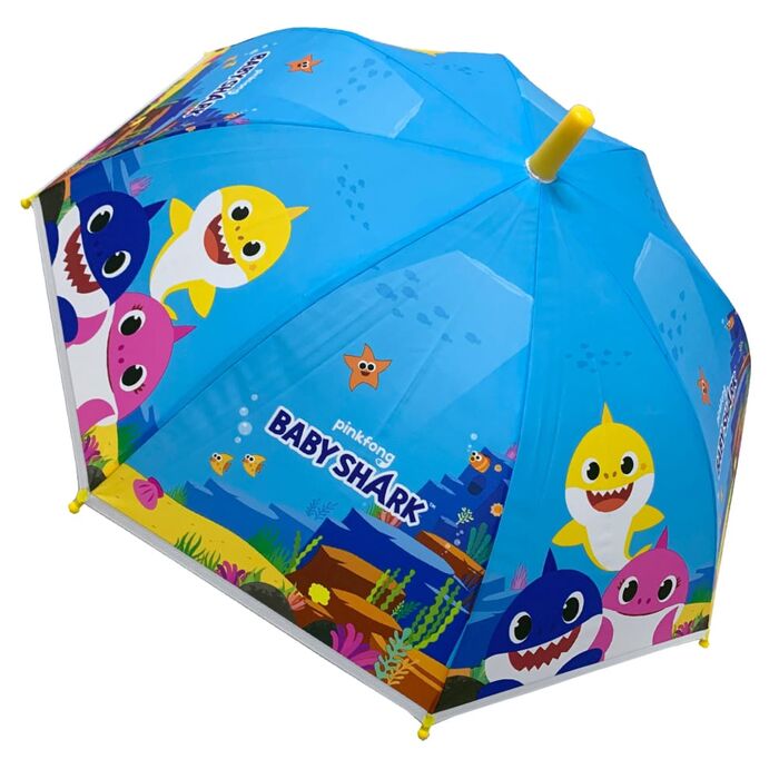 Ομπρέλα παιδική μονοκόμματη με χειροκίνητο άνοιγμα ασφαλείας, μεταλλικό άξονα, 8 ακτίνες μήκους 38cm fiberglass, αντιανεμική, διάμετρος ανοιχτής ομπρέλας ≈ 76cm, POE embossed και λαβή μαγκούρα, BABY SHARK