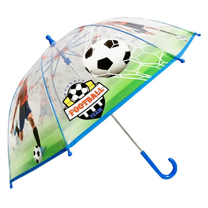 Ομπρέλα παιδική μονοκόμματη με χειροκίνητο άνοιγμα ασφαλείας, μεταλλικό χρωματιστό άξονα, 8 ακτίνες μήκους 45cm fiberglass, αντιανεμική, διάμετρος ανοιχτής ομπρέλας ≈ 90cm, POE embossed και λαβή μαγκούρα. FOOTBALL