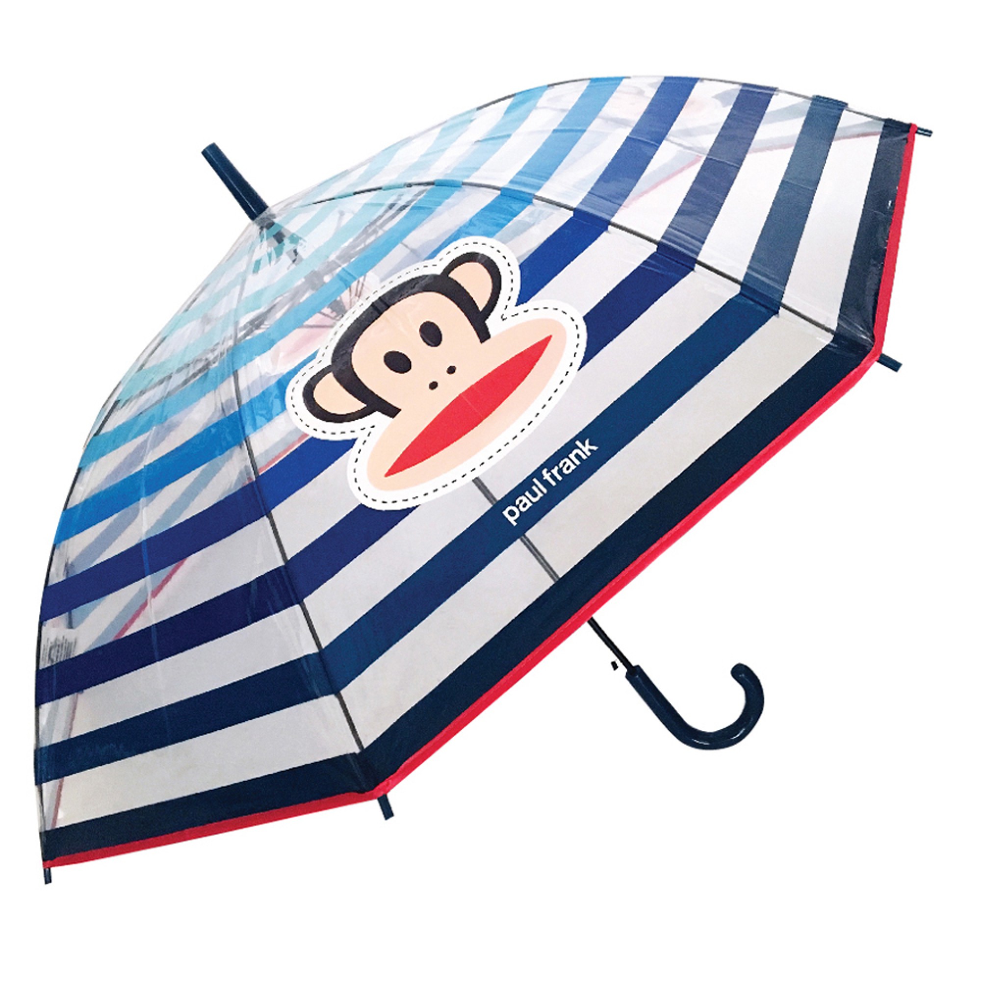 Ομπρέλα unisex μονοκόμματη με αυτόματο άνοιγμα , μεταλλικό μαύρο σκελετό, 8 ακτίνες μήκους 58cm, αντιανεμική, διάμετρος ανοιχτής ομπρέλας ≈ 116cm, POE διάφανη ριγέ και πλαστική λαβή μαγκούρα .PAUL FRANK